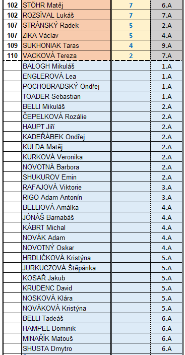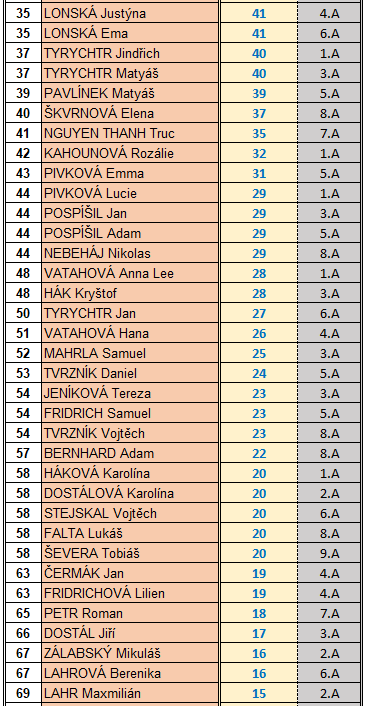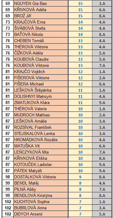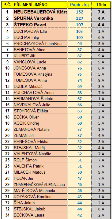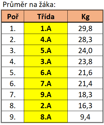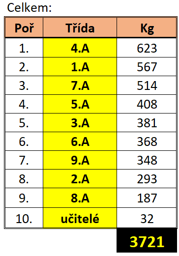 Letos to na prvních místech bylo velice těsné, rozhodovalo pár kilogramů. Nejúspěšnějšími sběrači se stala 4.A (623 kg; 28,3 kg na žáka). Z jednotlivců nejvíce nasbírala Neugebauerová K. (7.A - 152 kg), Spurná V. (4.A - 127 kg) a Štefko P. (4.A - 107 kg).