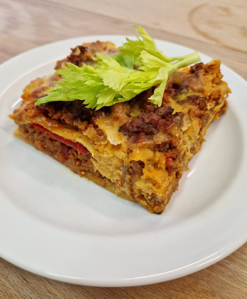 🍝 Hlavní jídlo: Lasagne s boloňskou omáčkou – vrstvy čerstvých těstovin, voňavé směsi mletého masa, rajčat, bylinek a jemného bešamelu.