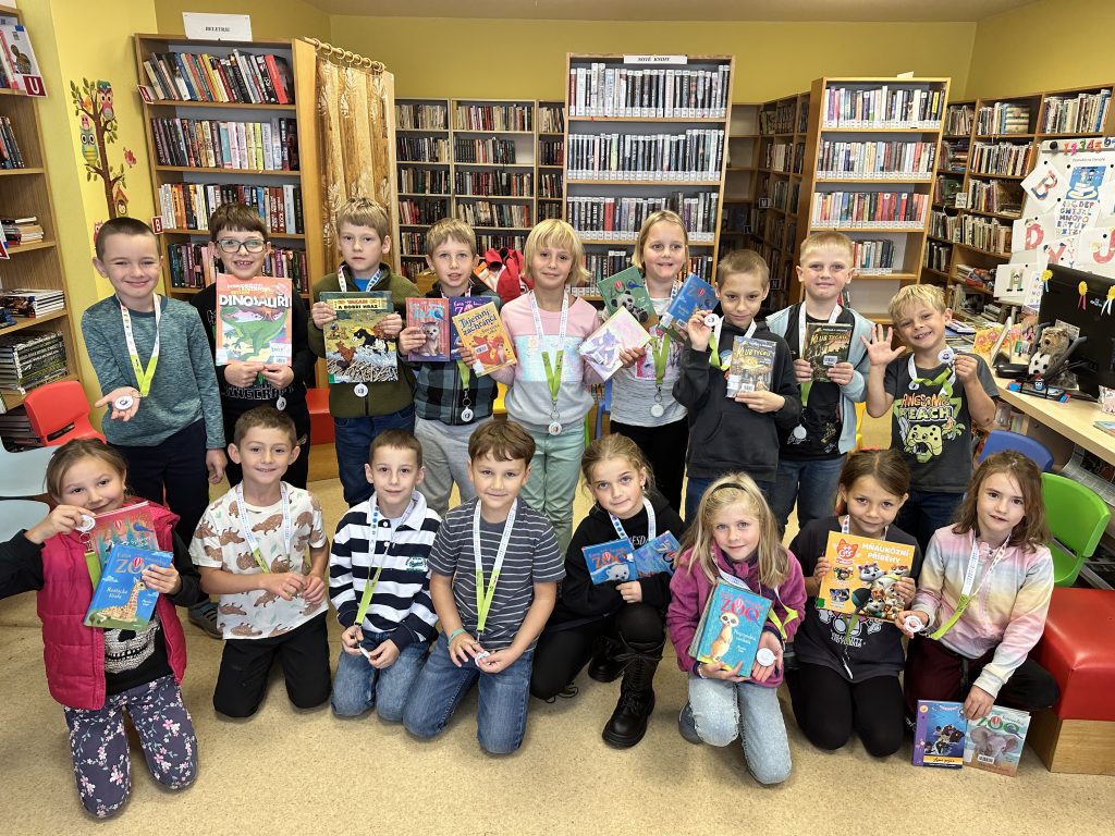 Po prázdninách se z prvňáčků stali druháci a nabízelo se domluvit si setkání v knihovně, kde malí čtenáři prokázali své čtenářské dovednosti. Některé z dětí se nestyděly a přečetly z vybraných knih pár odstavců textu. Paní Štěpánová, místní knihovnice, dětem ukázala jednotlivá oddělení a konkrétní knihy, které jsou vhodné pro čtenáře jejich věku. Následovalo samotné listování vybranými knihami. Velkou odměnou byla skutečnost, že si oblíbené čtivo mohly děti zapůjčit na měsíc domů. Jako obvykle se žákům návštěva tohoto zařízení velmi líbila a před vlastním odchodem zpět do školy byli ještě odměněni krásnou medailí s nápisem: Jsem čtenář. Cestou zpátky jsme si vybrali jako místo ke svačení kvetoucí zahradu za místním úřadem a hezky tak zakončili páteční dopoledne.