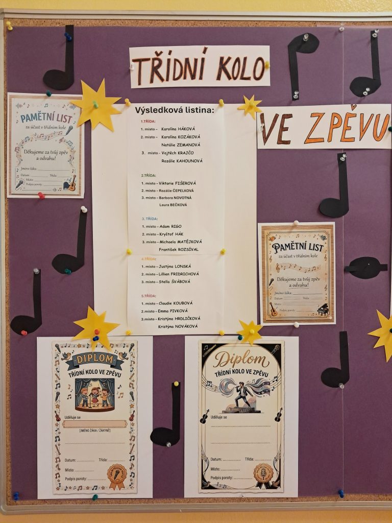 V týdnu od 20. 4. do 24. 4. se u nás ve škole konala v jednotlivých třídách 1. stupně TŘÍDNÍ KOLA VE ZPĚVU. Okouzlující atmosféru a naplňující pocit si odnášeli nejen vystupující, ale i posluchači. V každém ročníku byla tři postupová místa, ze kterých se vybraní žáci těší na KOLO ŠKOLNÍ, které se uskuteční 12.5. v prostorách naší školy.