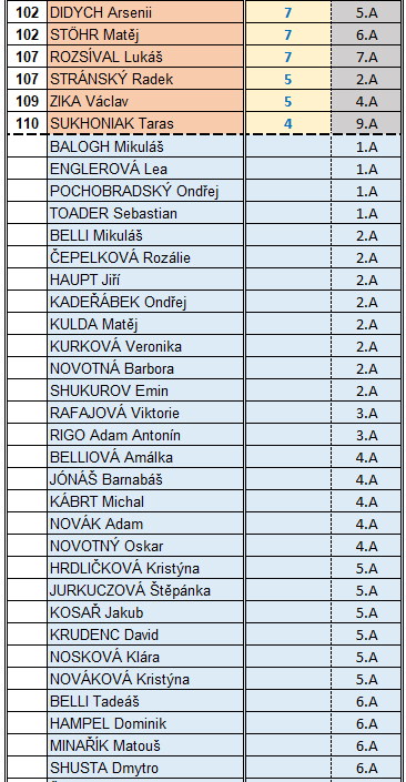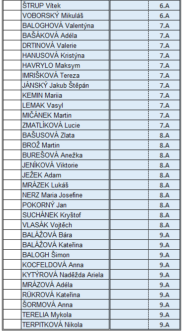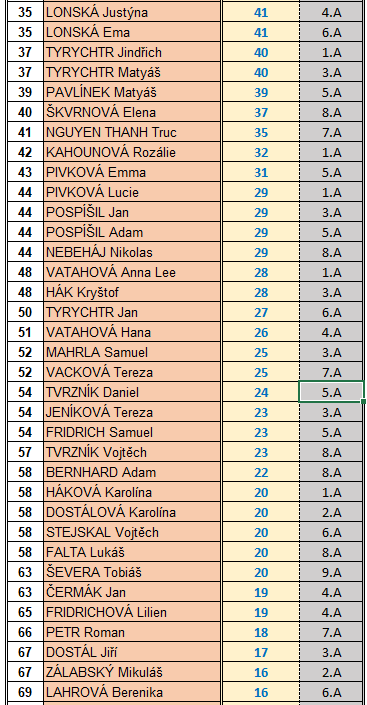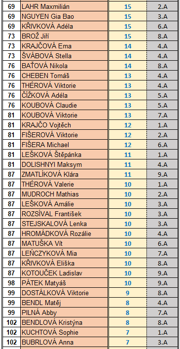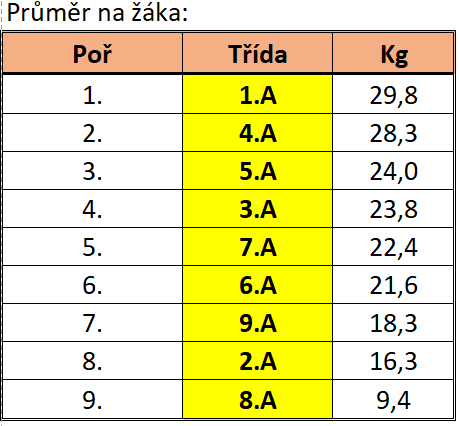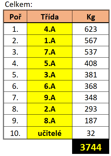 Letos to na prvních místech bylo velice těsné, rozhodovalo pár kilogramů. Nejúspěšnějšími sběrači se stala 4.A (623 kg; 28,3 kg na žáka). Z jednotlivců nejvíce nasbírala Neugebauerová K. (7.A - 152 kg), Spurná V. (4.A - 127 kg) a Štefko P. (4.A - 107 kg).