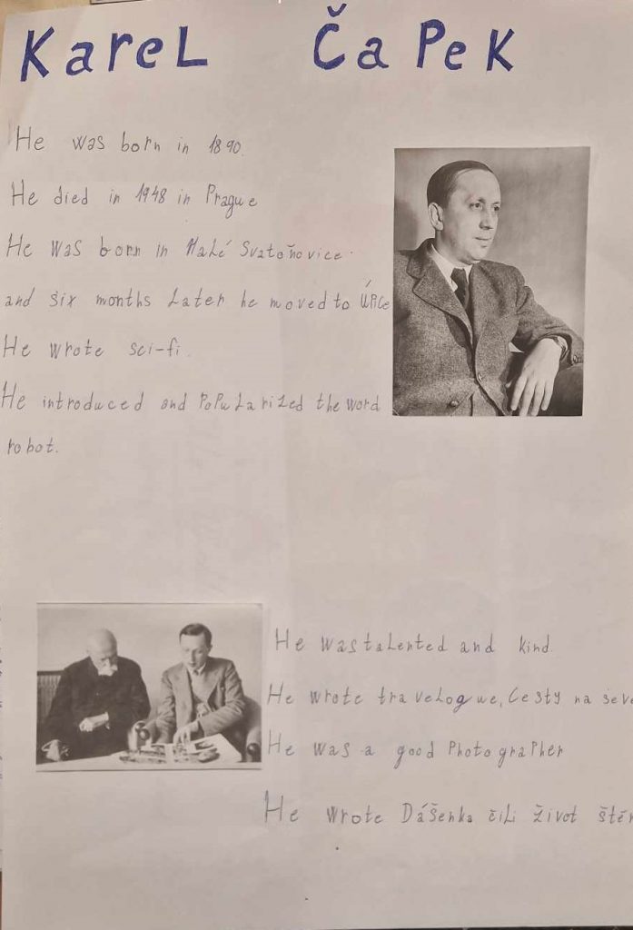 Část žáků 7. třídy (kteří nejeli do divadla) popisovali slavné (již nežijící) české osobnosti "FAMOUS CZECH PERSONALITIES". Jejich výběr osobností byl velmi příjemným překvapením. Procvičovali minulý čas prostý, slovní zásobu i znalost českých osobností. Vybrali si např. Věru Čáslavskou, Karla Čapka, Františka Křižíka, Jana Beneše, Josefa Bicana, Ottu Wichterleho nebo Josefa Šurala.