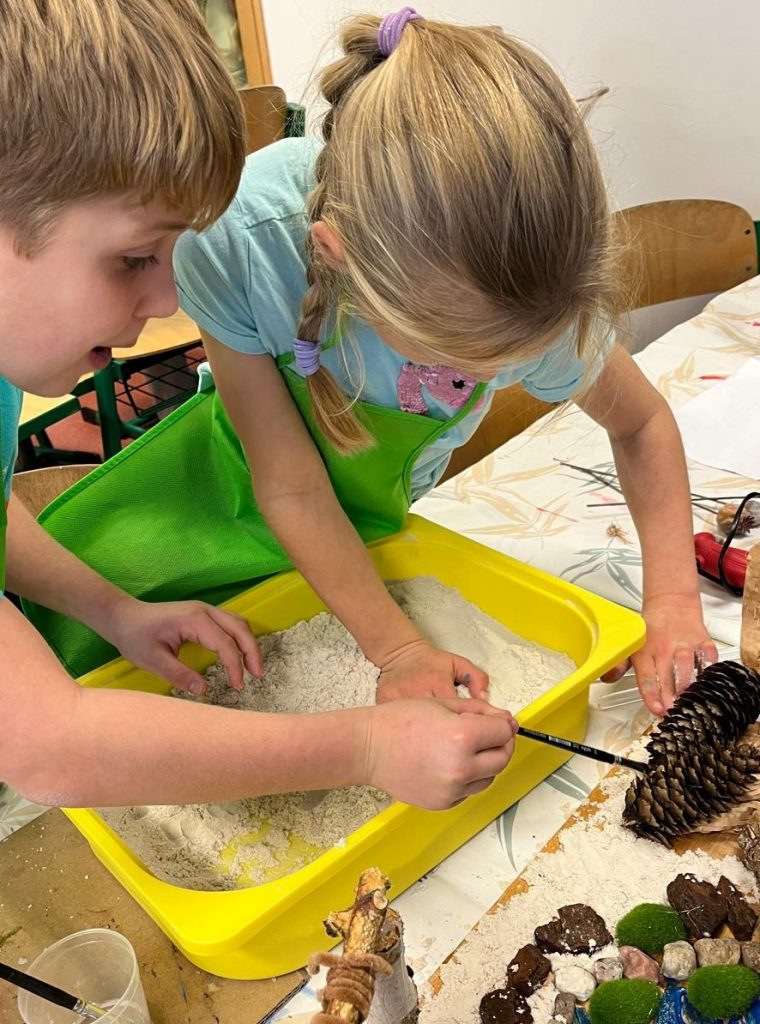 Při tvorbě používaly písek, dřevo, šišky, kůru, mech, sušené květiny, kameny i papírové kelímky. Zkoumaly vlastnosti jednotlivých materiálů, co vydrží, jak se dají spojovat a k čemu se hodí. Součástí indiánské osady se stala i houpačka, kterou děti samy navrhly a zakomponovaly do celku.